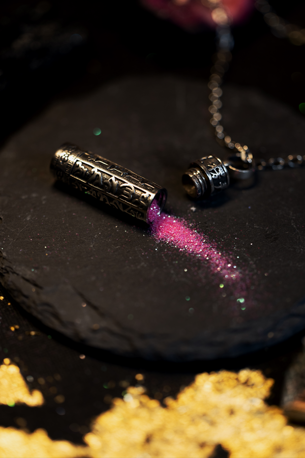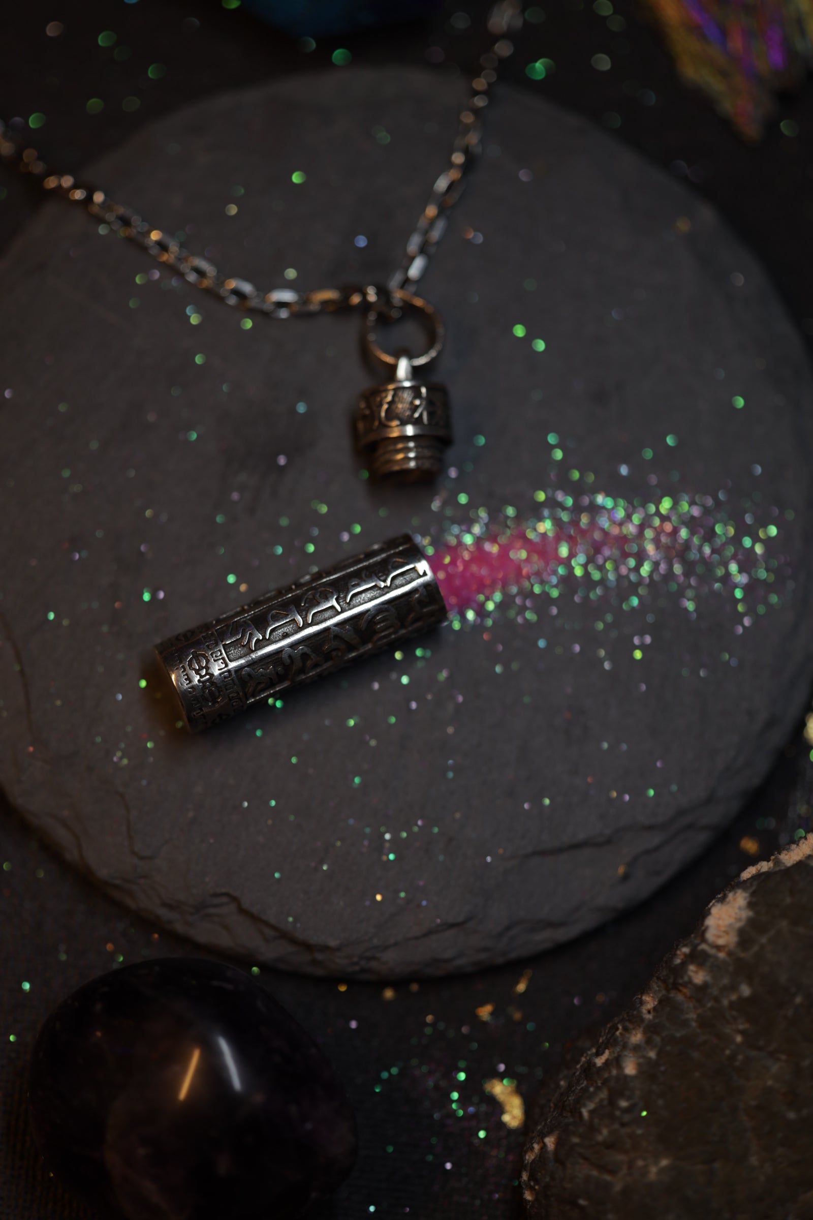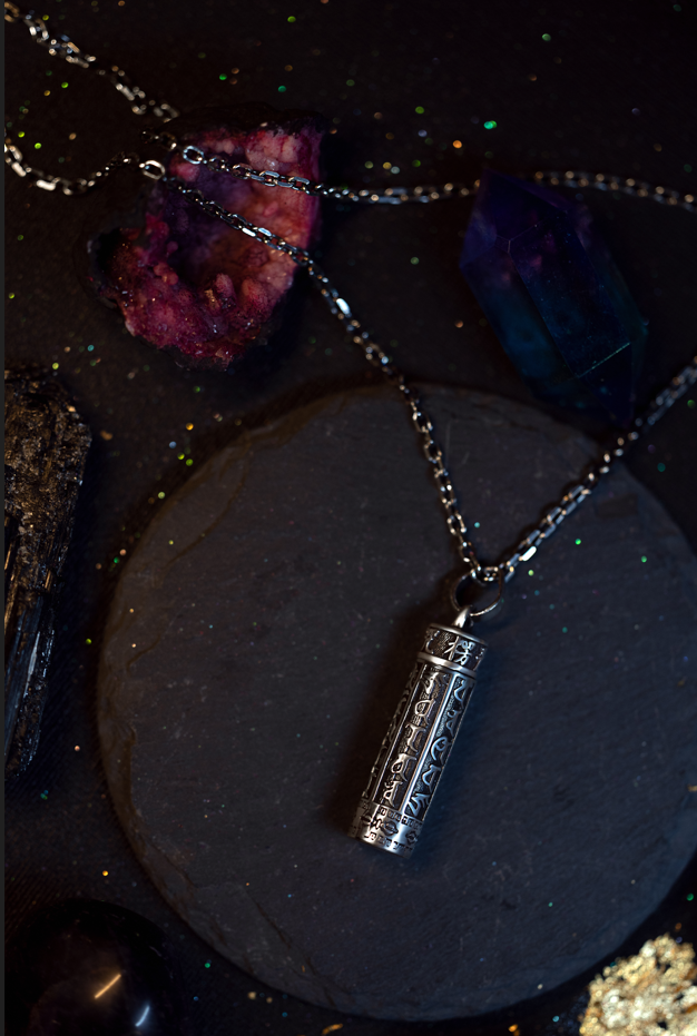 Protective mantra box pendant in solid 925 silver on a 65 cm chain. Minimalist design, symbolic detail, collectible style.